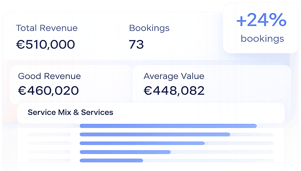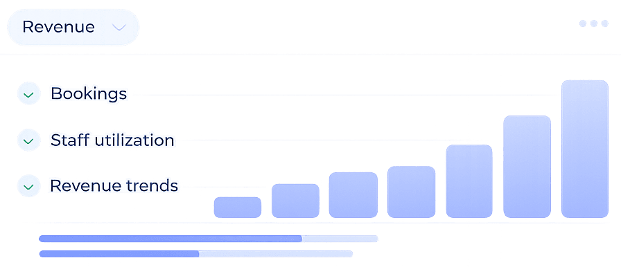 Track bookings, staff utilization, and revenue trends in one place so your team can move faster every week.